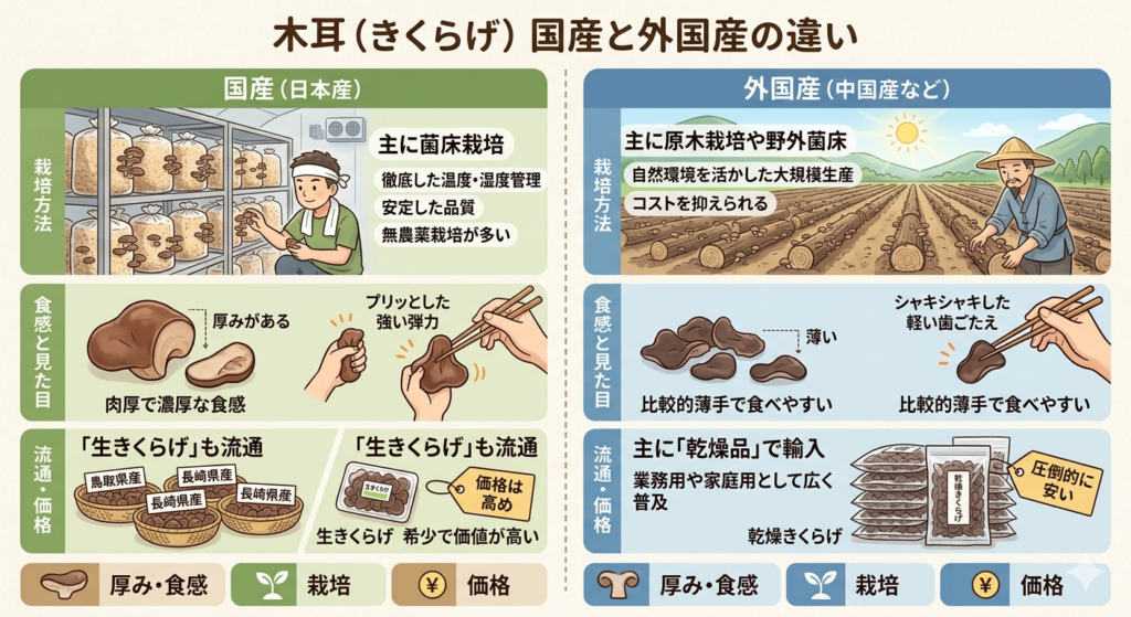 きくらげ(木耳)の国産と外国産(主に中国産)には、主に栽培方法、食感、そして価格の3つのポイントで大きな違いがあります。