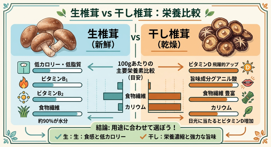| 栄養成分 | 生椎茸 | 干し椎茸(乾燥状態) | 期待できるメリット |