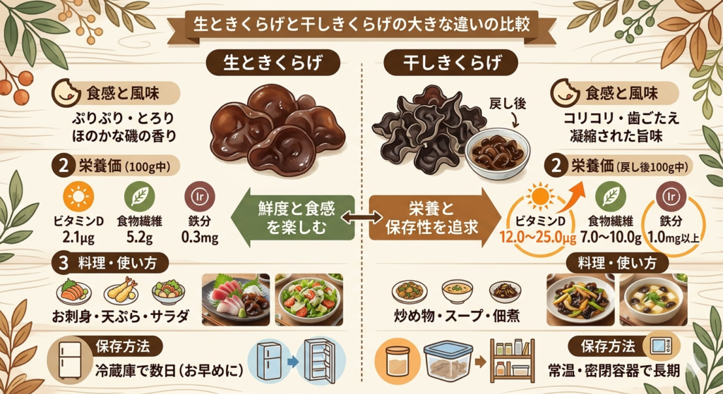 生(なま)きくらげと干しきくらげは、同じ食材でありながら、その特性や栄養価には驚くほどの違いがあります。それぞれの強みを活かすための比較をまとめました。